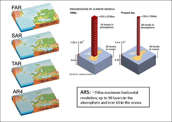 The figure below illustrates the advances made in typical spatial resolution used in state-of-the-art climate models around the times of each of the first four Assessments of the Intergovernmental Panel on Climate Change. Resolution improved from about 500km in 1990 (FAR = First Assessment Report), to as fine as 110km in 2007 (AR4 = Fourth Assessment Report). Current CMIP5 models assessed in the IPCC Fifth Assessment Report (AR5) have a finest horizontal resolution in the atmosphere of around 70km, but the average is about 200km. The vertical resolution has also improved over the years. For the First Assessment Report from the IPCC models had a single-layer "slab ocean" and 10-15 atmospheric layers while Fourth Assessment Report models often included 30 layers in the oceans and another 30 in the atmosphere. Current CMIP5 models assessed in the AR5 have a vertical resolution in the atmosphere of 20-50 levels.