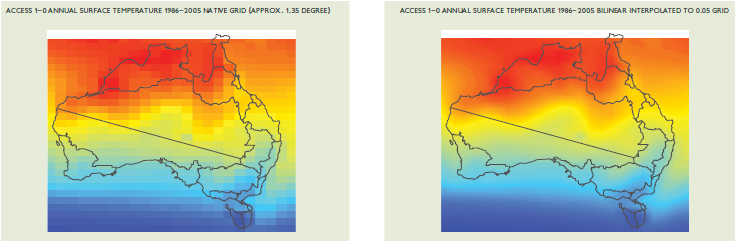 Some statistical methods can make maps look more accurate through re-gridding to a finer scale. It is important to note that bi-linear interpolation, the process used to re-grid the maps in the following figure, does not add extra information about climate change and therefore the finer resolution map (right) is not more accurate than the coarser resolution data (left). Pay close attention to the mapping technique used in spatial representations of future climate change.