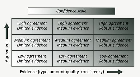 Confidence language has been specified by the Intergovernmental Panel on Climate Change (IPCC) for their Fifth Assessment Report which considers factors along two dimensions; evidence (type, amount, quality and consistency), and agreement between those lines of evidence. A confidence rating can be assigned using calibrated language based on expert judgment of the various lines of evidence (see Figure). As in IPCC, confidence is expressed using the qualifiers ‘very high’, ‘high’, ‘medium’, ‘low’ and ‘very low’.