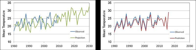 Descriptions of future regional climate are usually referred to as ‘projections’ (or ‘scenarios’, see below). Projections have a range of uncertainty for a given a climate variable due to differences between the results of various climate models. A climate change ‘projection’ is also conditional on the choice of emission scenario. This conditionality is the primary reason a projection is not called a ‘prediction’. A prediction estimates the sequence of events in the future, including the effects of both climate change AND variability (see figure).