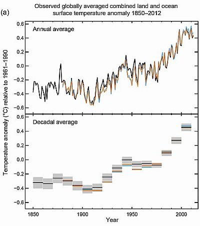 Observed globally averaged combined land and ocean surface temperature anomaly 1850-2012. SOURCE: IPCC 2013