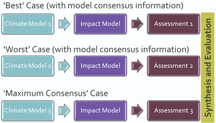 - Define the key cases of interest, usually best case, worst case and maximum consensus. For example, a worst case for a cropping study is likely to be the hottest and driest future.