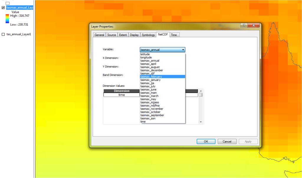 At this point different layers within the file can be viewed (Figure 5). Right click on the map description on the Table of Contents and view the layer properties. In the Layer Properties box, select the NetCDF tab and explore under the variable list to see the different file 'layers' contained in the NetCDF file.