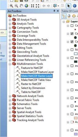 Start an ArcGIS Application, for example, ArcMap and open the ArcToolbox window with the Show/Hide ArcToolbox Window button found on the standard toolbar. Navigate to the Multidimension tools toolbox and access the ‘Make NetCDF Raster layer’ tool (Figure 2).