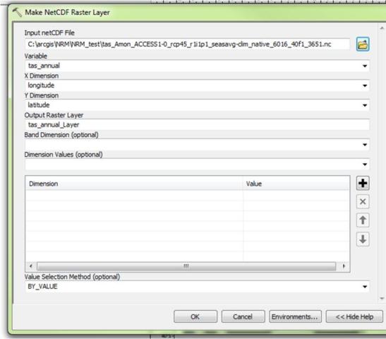 Load the NetCDF file into the ‘Make NetCDF Raster Layer’ tool and select the variable of interest e.g. tasmax_annual (Figure 3). It is a good idea to describe the Output Raster Layer with the ‘model name/RCP’ as this is not carried through into the loaded file in ArcGIS.