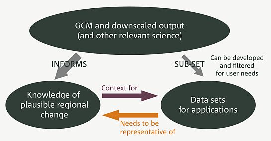 Schematic of how climate model output contributes to knowledge of plausible regional change and data sets for applications