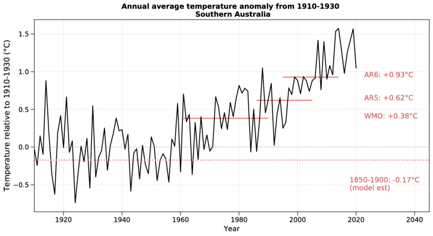 Using this method, up to the recent decade Australia has warmed by an estimated 1.6 °C (2011-2020 minus 1850-1900), which is slightly higher but within the uncertainty range of change measured as a linear trend for 1910-2019 (1.44 ± 0.24 °C), and around 1.4x the global average and 0.9x the global land average. Temperature changes for 1850-1900 to 2011-2020 by state are between 1.1 °C in Tasmania to 1.7 °C in South Australia (see below). The values are similar to or slightly hjgher than the linear trend for 1910-2019, with the small differences being the net result of showing warming from an earlier period and using the difference between periods rather than a straight line fit to calculate warming.
