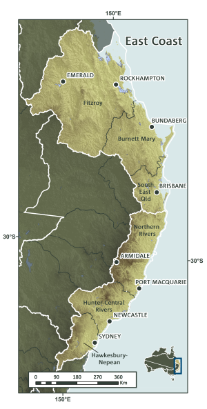 The East Coast cluster region comprises the six coastal regions from Rockhampton to Sydney. The region forms the central part of the eastern seaboard of Australia and encompasses the drainage basins of a number of major rivers that flow from important head-water catchments within sub-tropical mountain ranges through the coastal zone and into the Pacific Ocean. There is considerable variation in the East Coast cluster, both within and between the regions. The cluster includes five of the ten largest significant urban areas in Australia (Sydney, Brisbane, Gold Coast, Newcastle, Sunshine Coast), with the population of the region totalling over 42% of Australia’s total population (ABS 2013). Since January 2014, the previous Catchment Management Association regions (CMA) of NSW have been re-organised into new Local Land Services (LLS) regions. Dominant land uses of the region include extensive urban and peri-urban development, large scale dryland grazing, large mining centres, and valuable agriculture. Internationally significant natural features in the cluster region include the southern end of the Great Barrier Reef, biodiverse rich world heritage rainforest, unique islands and important coastal ecosystems.