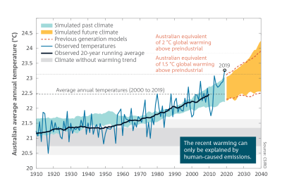 Figure 2. Australian average temperature observed and simulated from climate models. Past and future bands show the range of 20-year running average of climate model outputs. (Source: BoM & CSIRO 2020 State of the Climate)